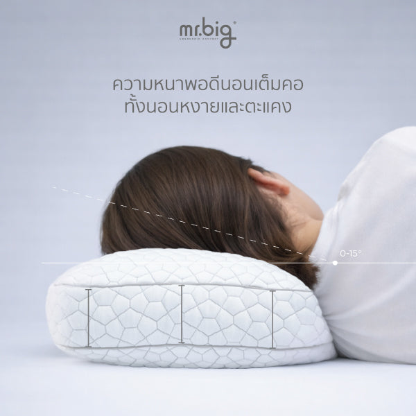 • คนนอนตะแคง: หมอนตั้งขอบเข้าเต็มซอกคอและบ่า รองรับได้ระดับพอดี